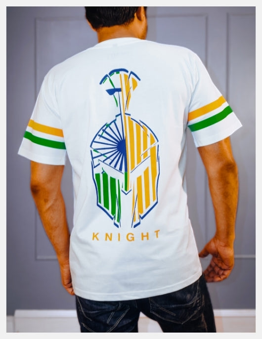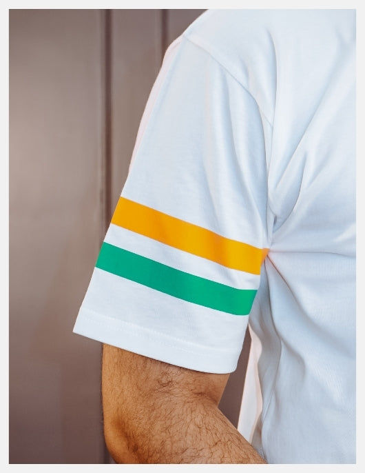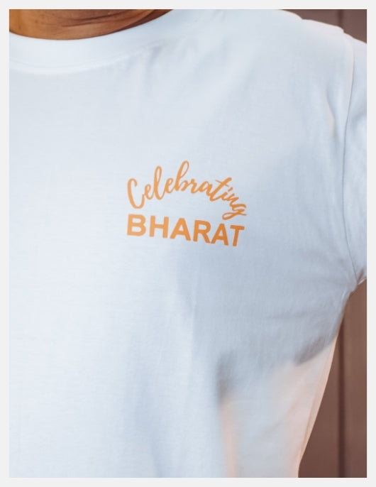 A striking round neck half sleeves white t-shirt that represents the strength and unity of India. Inspired by a timeless emblem of protection, this design features tri-color accents on the chest and bold prints on the back, symbolising India’s vibrant spirit.